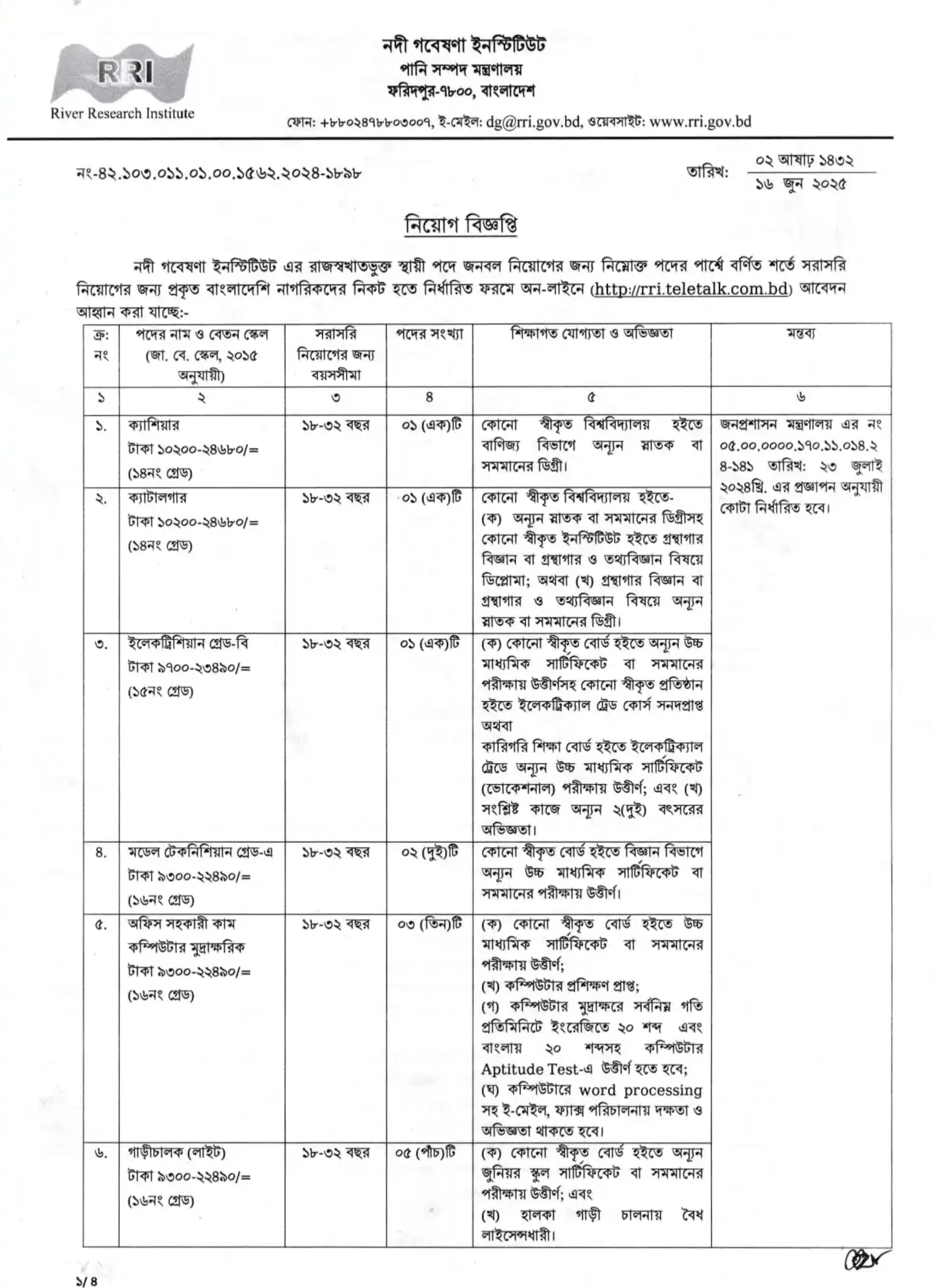 RRI Job Circular 2025-নদী গবেষণা ইনস্টিটিউট নিয়োগ বিজ্ঞপ্তি ২০২৫