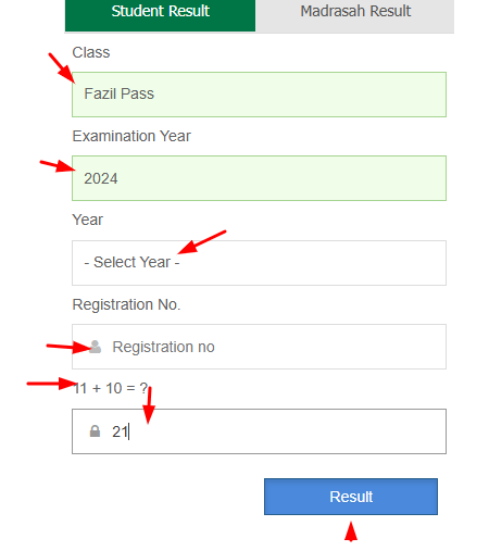 - অতপর “Registration No” এ ফাজিল পরীক্ষার রেজিস্ট্রেশন নম্বর 123456677 লিখুন।